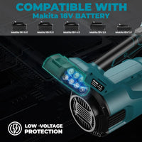 Équipé d’un moteur sans balais ultra-puissant et compatible avec les batteries Makita 18V, ce souffleur électrique portable est idéal pour éliminer feuilles, neige, poussière ou saletés, en extérieur comme en intérieur.